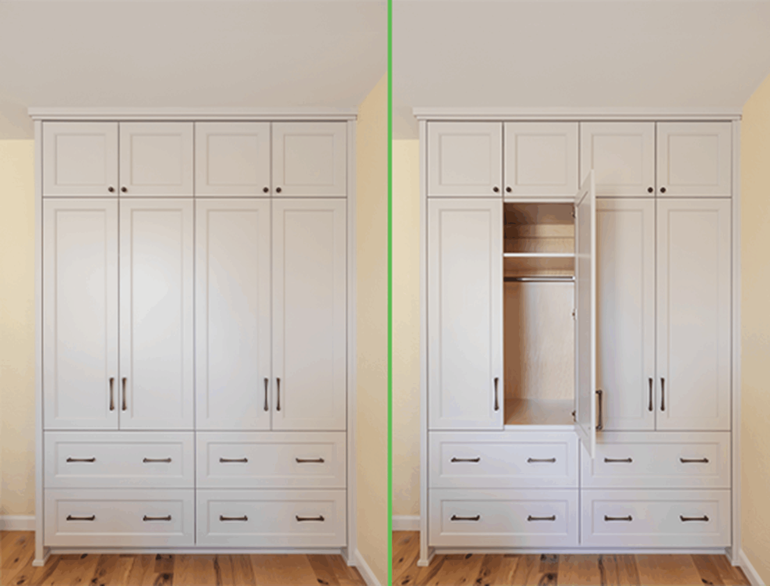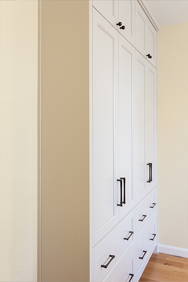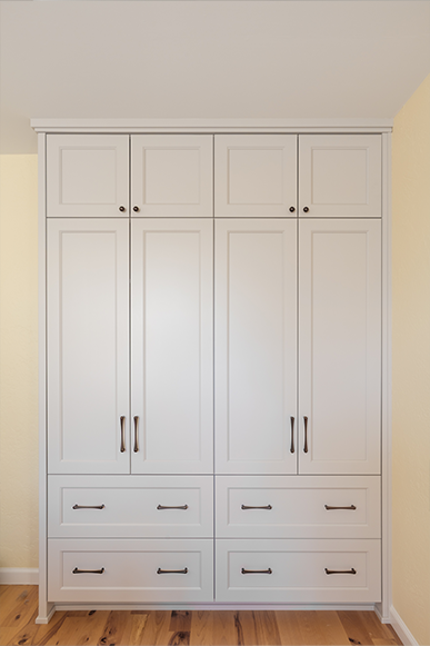 This closet appears just 12" deep but actually offers a full 24" of usable storage. This optical illusion keeps the bedroom feeling open while regaining the storage the homeowners needed.
