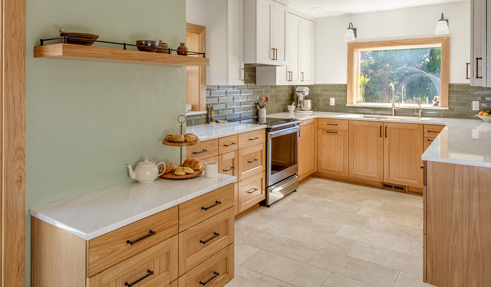 This whole home remodel in West Hills began with a simple goal: build a dream kitchen. But after meeting in person with the owner, Carl and designer, Raegan, the homeowners realized there was more potential to improve their space than they initially imagined. Leading to a full kitchen transformation, a spa-inspired bathroom remodel, an upgraded laundry room, and a custom-designed primary bedroom closet. The kitchen was completely gutted and reimagined from the ground up. Inspired by a Country aesthetic, Raegan worked closely with the homeowners to select the perfect wood species for their new cabinetry, ultimately landing on warm, character-rich brown hickory for the base cabinets, paired with soft off-white uppers for a bright yet grounded palette. Special custom inserts throughout dramatically improved functionality and storage, making the new kitchen both beautiful and highly practical. A new heated tile floor replaced the cold and outdated original tile, creating a more inviting surface that ties together the room’s natural textures and tones. In the bathroom, the primary goal was to create space for a spa-like soaking tub, something the existing layout couldn’t accommodate. To make it work, the design pushed into the primary bedroom closet, allowing for a deep soaking tub with a tile surround and a quartz waterfall edge. The updated layout also includes a walk-in tile shower with a lighted niche, custom hickory cabinetry topped with quartz counters, and a soothing, cool grey heated tile floor that complements the blue shower tile. The result is a serene, luxurious bathroom that feels like a retreat. To replace the original primary bedroom closet, Raegan designed a recessed custom closet that maintains an open feel while still offering full-depth storage. The laundry area was also reworked for both function and flow. What was once a pass-through was enclosed into a fully dedicated laundry room, complete with new tile flooring, custom cabinetry, and a space-saving pocket door. From functional storage solutions to warm, timeless finishes, this project beautifully blends form and function across the entire home, and we couldn’t be happier for these clients as they settle into their newly transformed space.