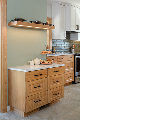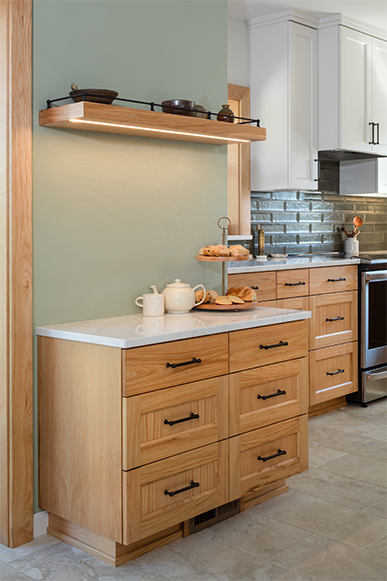 Since these clients are avid tea drinkers, a lower countertop tea station was incorporated into the design, creating the perfect spot to prepare and enjoy their tea.