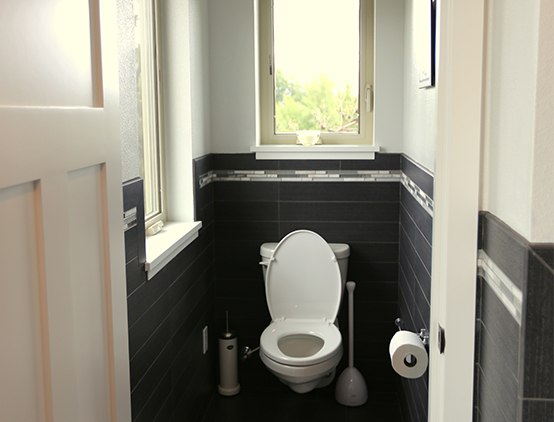 We installed tile wainscoting with a charming accent band in this water closet to add interest to this simple room and improve the cleanability.