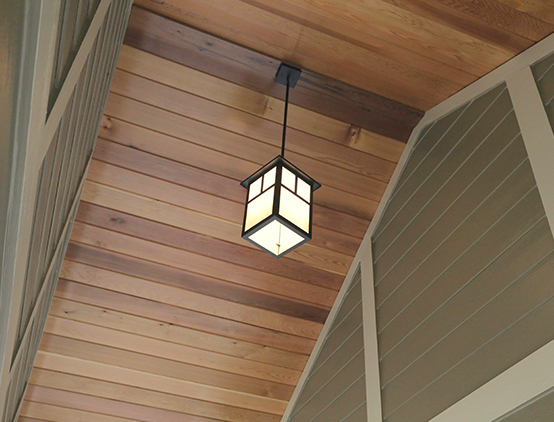 We added this wood tongue & groove paneling to the balcony ceiling, and it truly adds another level of beauty to this home. We love how the brown tones in the cedar complement the tones of the green exterior paint color!