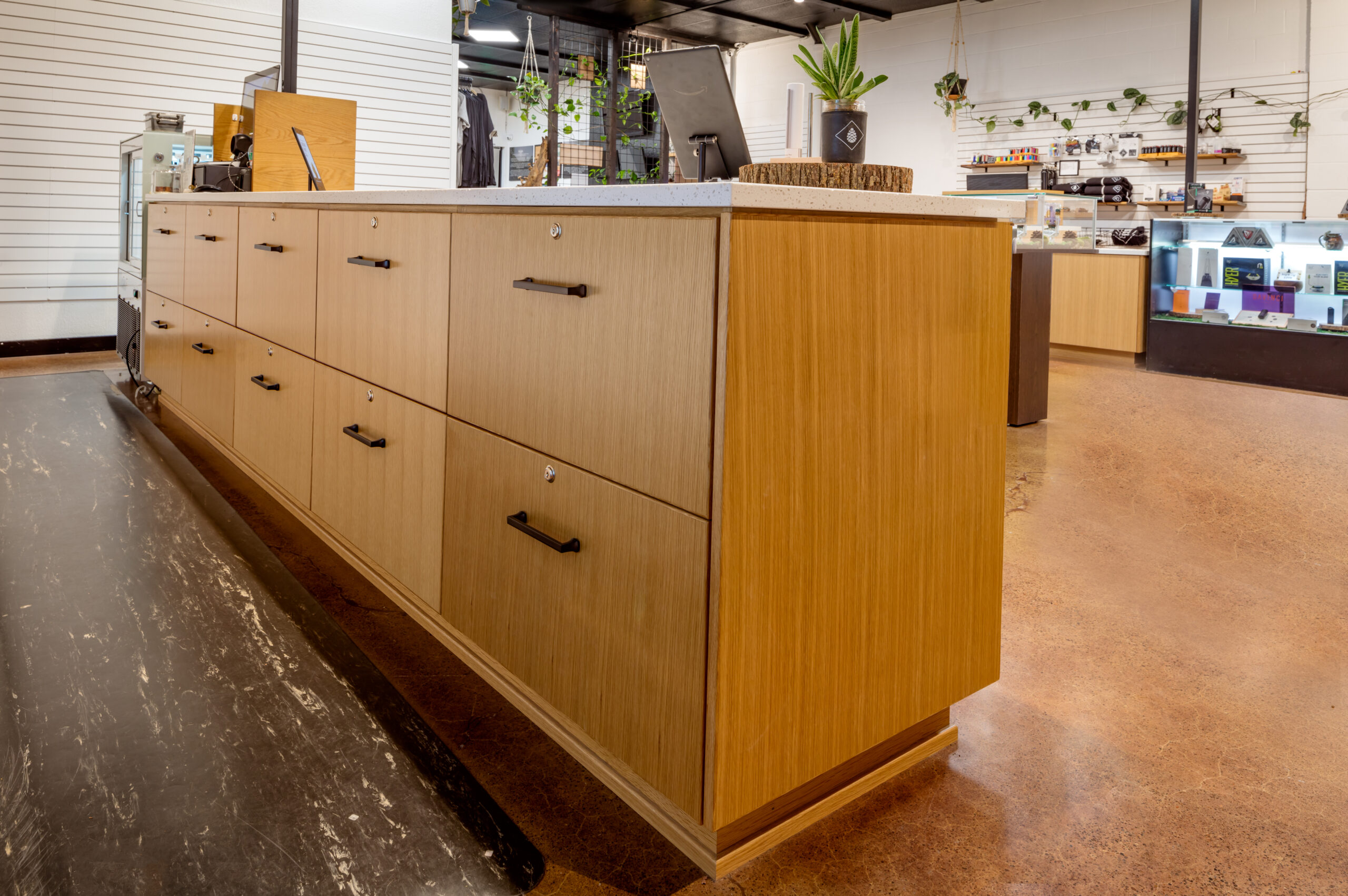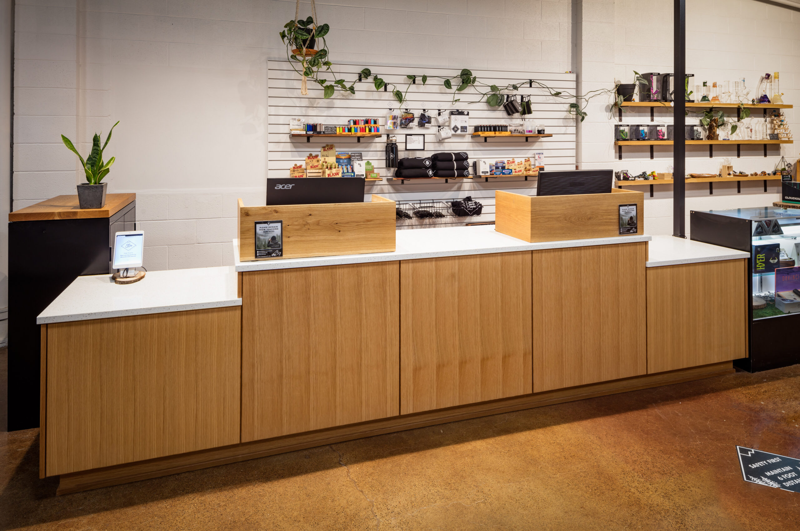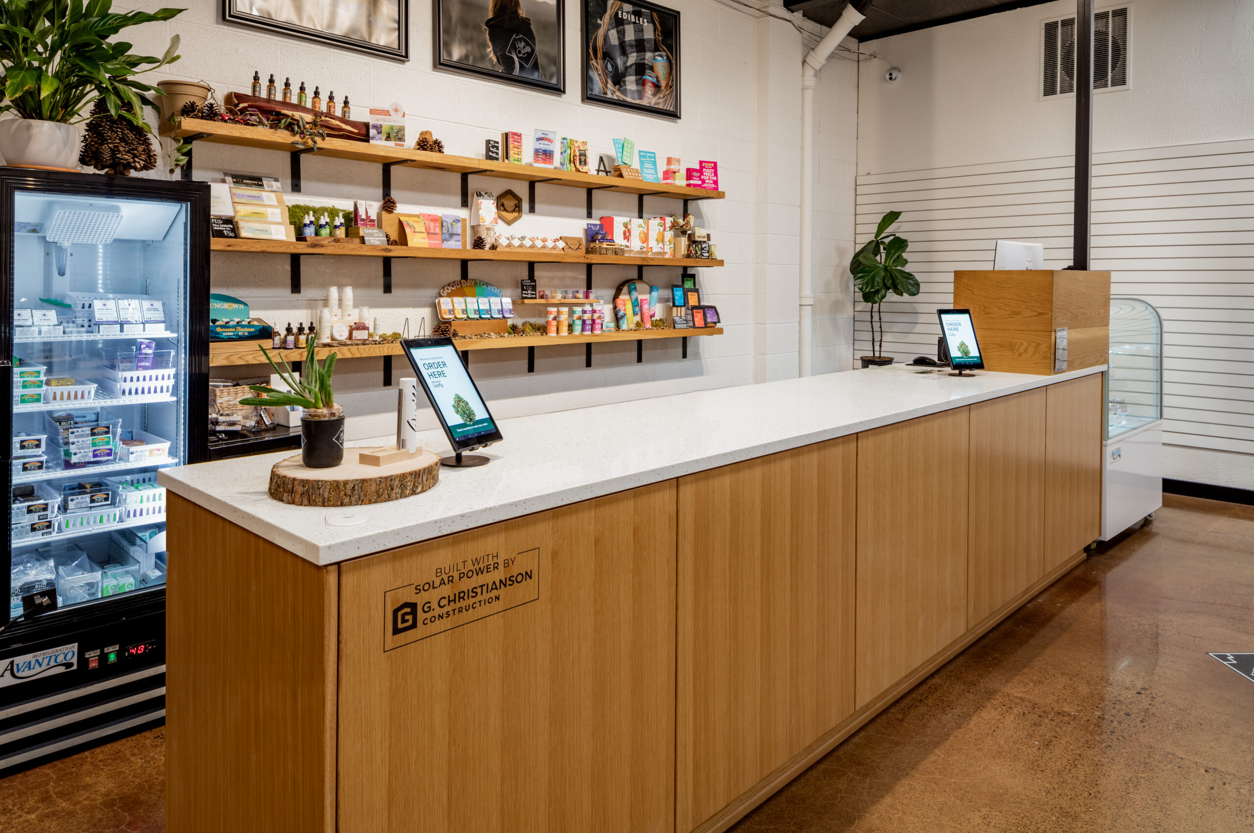 The Owners of High Quality Lifestyle Store & Dispensary in Corvallis, Oregon approached G. Christianson about remodeling a bigger space the company wanted to move their store into. The vision and branding of this business allowed for a unique design that maximizes efficiency, accessibility, and looks AWESOME. The design of the space takes the customer through a journey before completing their purchase at the peak of the on-brand "mountain", symbolized by the cabinet height and white snowy colored quartz countertop. This building has been transformed from one large space to two separate spaces, satisfying code requirements with the City in a cost-effective way.