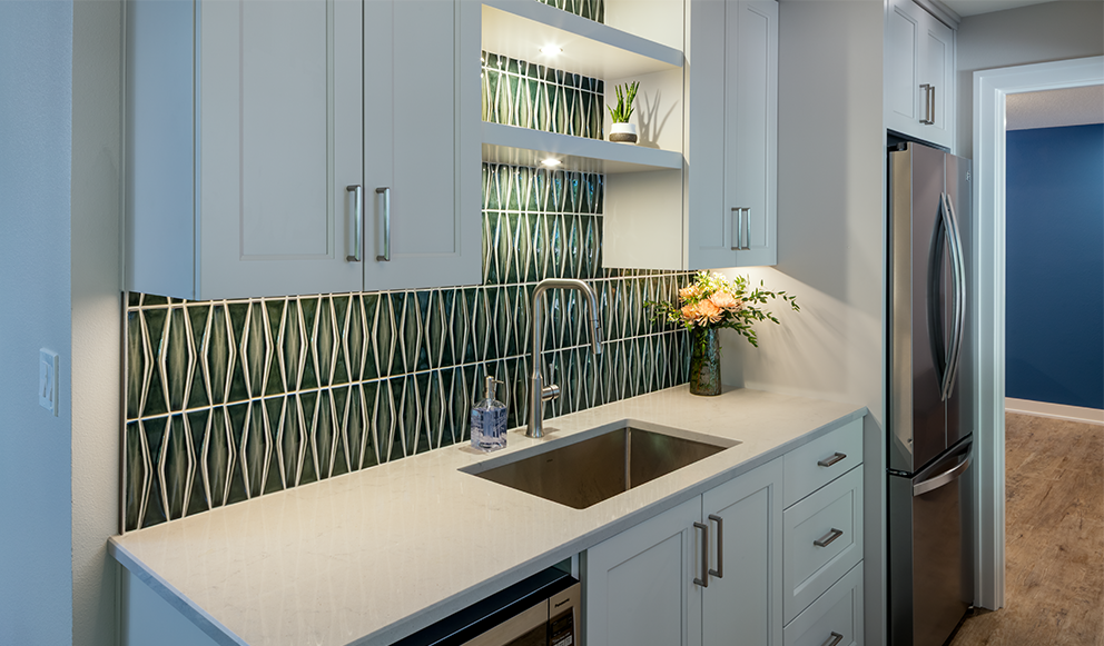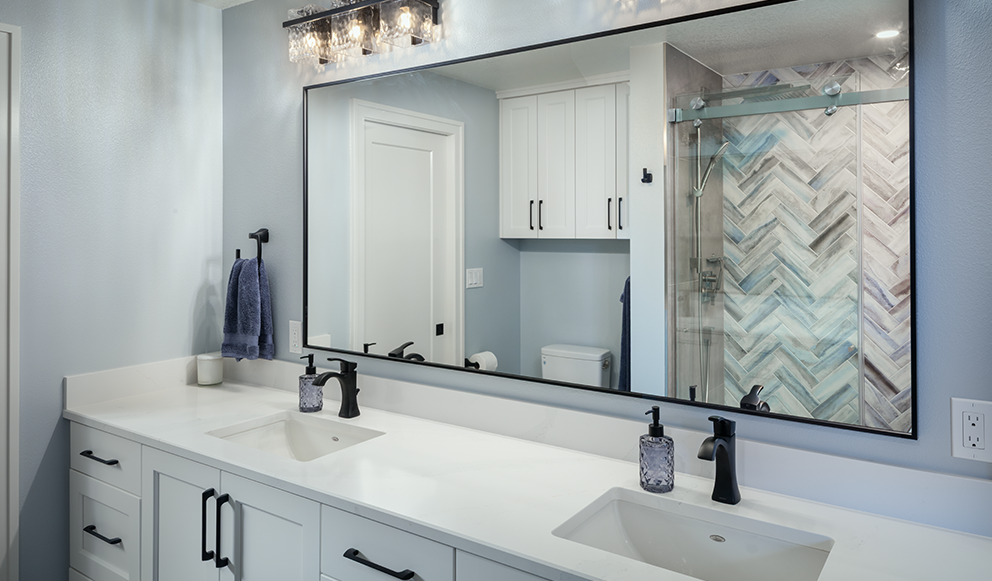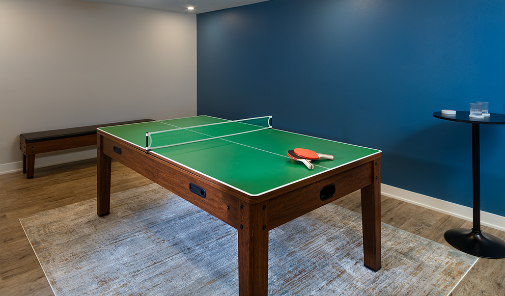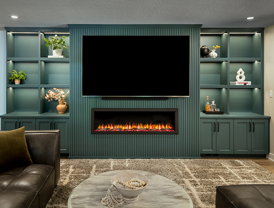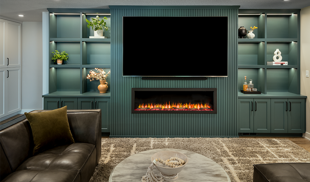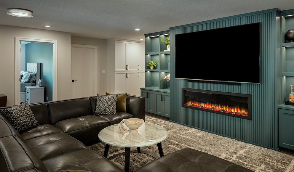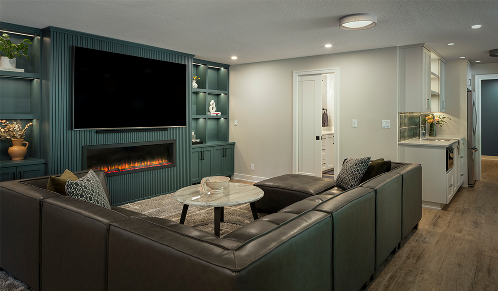 This Timberhill basement underwent a remarkable transformation, turning an outdated space into a sophisticated, multifunctional living area. Returning clients, who previously entrusted us with their kitchen renovation in 2020, invited us back to reimagine their basement to reflect the elevated design and craftsmanship found throughout the rest of their home. The expansive lower level, originally featuring three bedrooms and a bathroom, was thoughtfully redesigned within its existing footprint to include a newly added kitchenette and a fully custom entertainment center. These additions brought fresh energy and a modern aesthetic to this 1990s home. Each bedroom received a comprehensive refresh with updated trim, electrical upgrades, new doors, and a curated color palette. To create a cohesive yet personalized atmosphere, each room was painted in a unique shade of blue, contributing to the basement’s cool, calming tones. One of the bedrooms was transformed into a lively game room, complete with a versatile 3-in-1 game table offering ping-pong, pool, and air hockey, perfect for family fun. The bathroom now serves as a serene retreat, featuring a striking tile accent wall in the shower, complemented by smooth grey tiles, elegant new cabinetry, quartz countertops, and upgraded plumbing and lighting fixtures. The result is a space that feels both luxurious and restorative. At the heart of the remodel is the custom-built entertainment center, crafted by our in-house cabinet shop. This stunning feature includes open shelving, concealed storage, a sleek tambour accent wall, and integrated technology. It houses a large flat-screen TV, Samsung soundbar, and a modern linear electric fireplace. Just around the corner, the new kitchenette showcases a gorgeous tile backsplash and offers the perfect spot for refreshments during game nights or movie marathons. For our clients, it was essential that the basement become a true gathering place that is functional, welcoming, and built for family. Now complete, the space is perfectly suited for hosting game days, reunions, and everyday relaxation. The transformation not only elevated the home but also redefined how the family lives and connects in it.