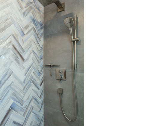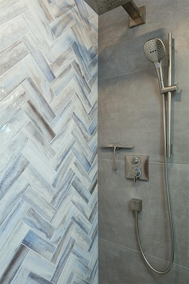 This striking shower accent wall presents Glazzio tiles arranged in an elegant herringbone pattern. The unique variation in each tile adds depth and visual interest, creating a serene, spa-like ambiance within the space.