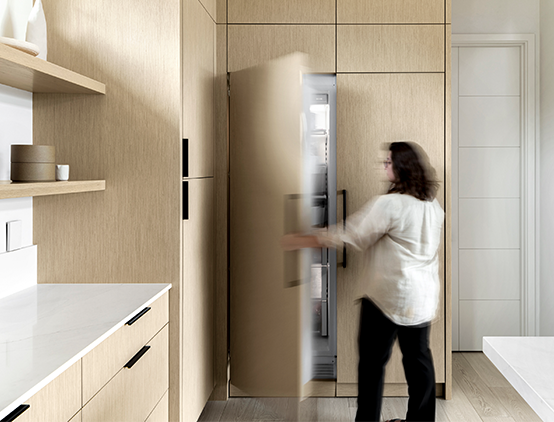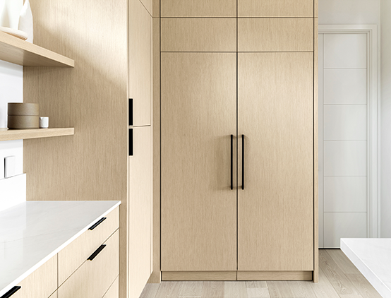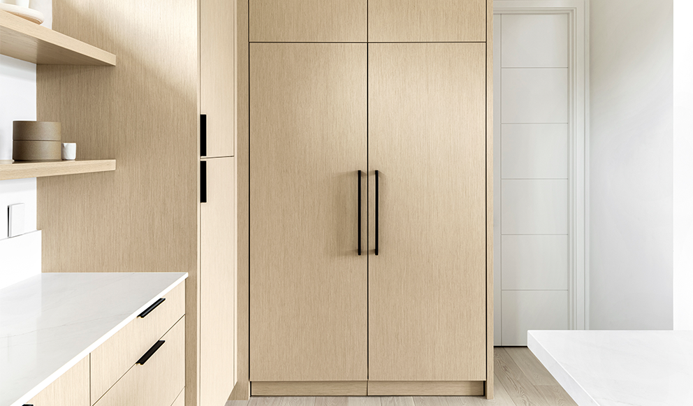 Our team created custom panels to conceal the Sub-Zero refrigerator and freezer, including toekick covers that allow ventilation. Extra touch-latch doors above the appliances open for additional storage.