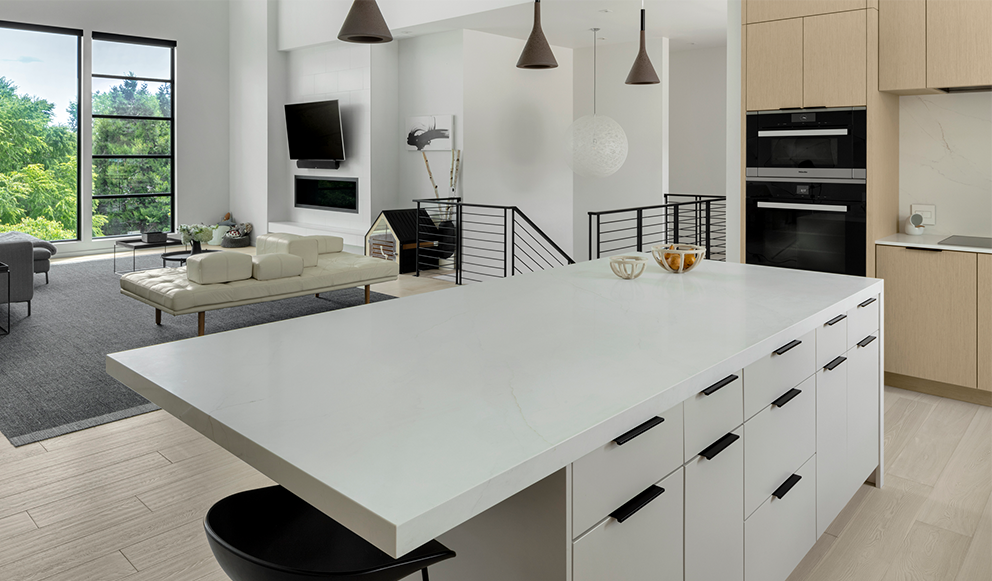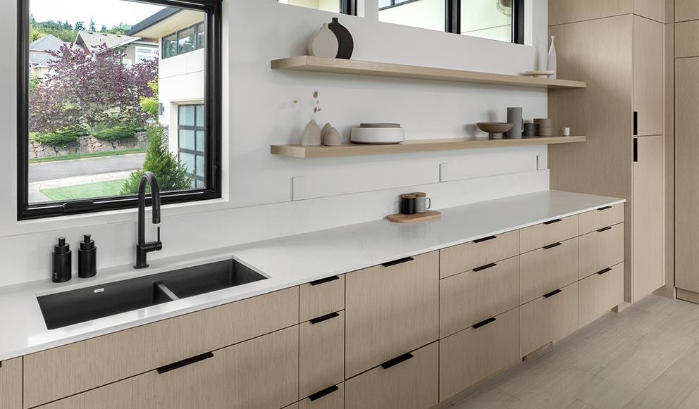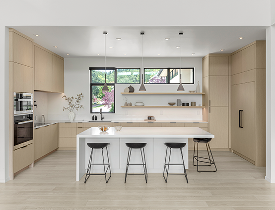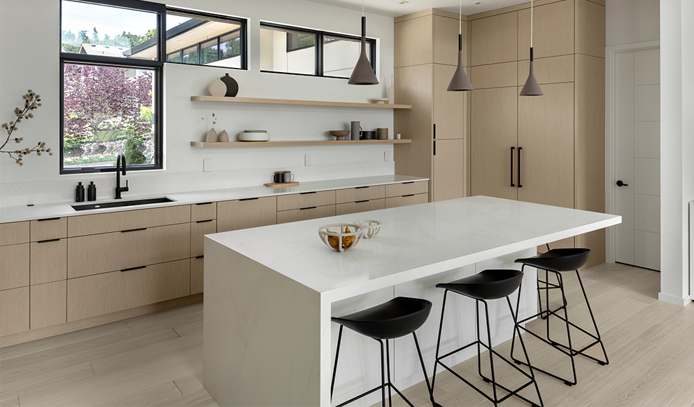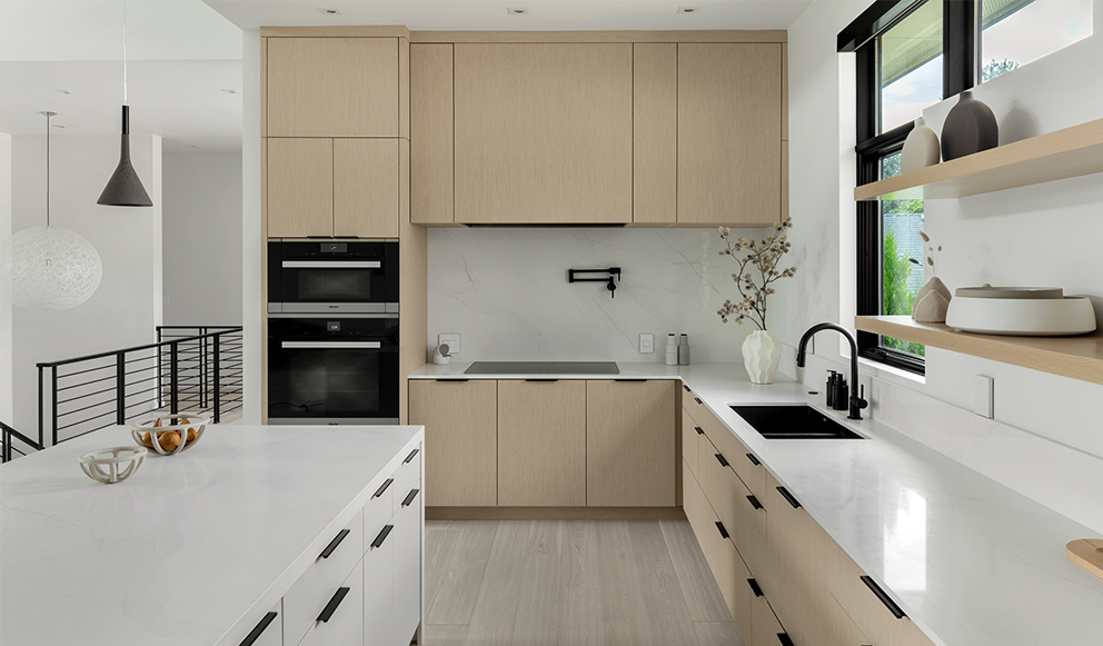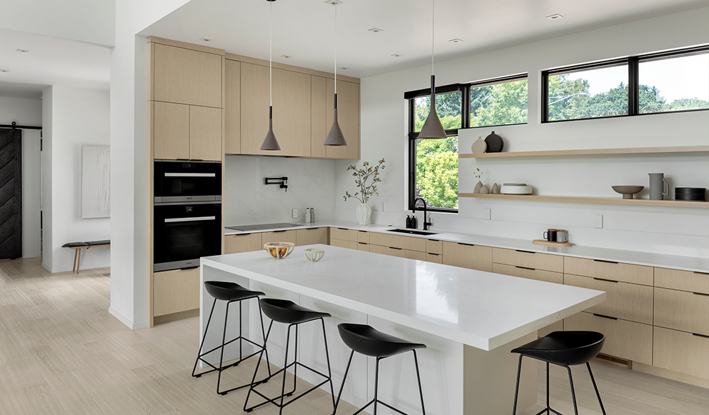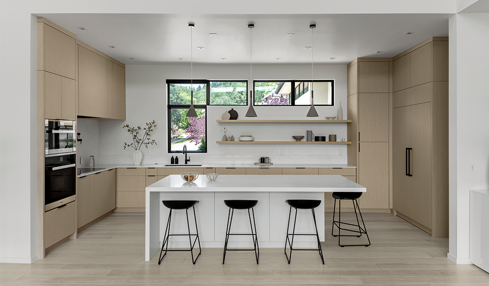 This kitchen remodel was borne from a leaking water line that damaged much of the flooring and many of the existing cabinets. The G. Christianson team made a quick plan with the homeowners for the best path forward – repair the damage and create a new kitchen! Designer, Anna Clink, preserved much of the original layout, while making several improvements. The designer and homeowner determined that better cabinetry storage was crucial. The G. Christianson Custom Cabinetry division included swing-out blind corner storage to make use of all the hard-to-reach areas, custom utensil and storage roll-outs, tray dividers, and custom drawer inserts. Not only was storage important, but a modern kitchen aesthetic that blended with the rest of this Timberhill home. Many of the appliances, such as the Sub-Zero refrigerator and freezer, the dishwasher drawers, and an exhaust fan insert were all paneled to conceal them from view. A Blum electric-powered roll-out trash & recycle center is also concealed by panels. The new design also extended the length of the island, and added a straight-grain White Oak veneer to the cabinetry, made in Italy by TreeFrog. The soft oak color creates a warmth that the original all-white kitchen did not have. Slim cabinet edge pulls and touch-latch doors create clean lines through the space. The in-house cabinetry team put extra effort into scribing all of the cabinetry wood to the surrounding surfaces for a modern touch. Other features include a pot filler, a solid quartz slab backsplash, a quartz waterfall island end, concealed outlets, bar seating, and integrated LED under-cabinet lighting. We couldn’t be happier for these homeowners and their new kitchen!
