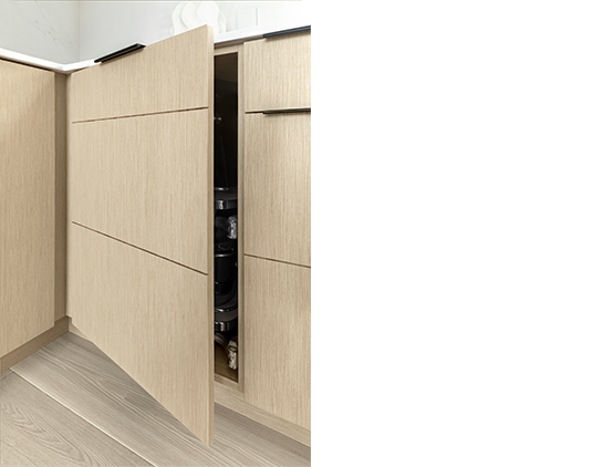 Many panels in this kitchen include kerf cuts, shallow cuts in the surface that create the illusion of separate panels. This special door is made to look like drawers, but is a solid, single panel.
